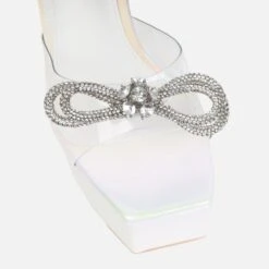 These shimmer platform heels are a statement! Featuring a square toe, diamante bow, ankle buckle strap, platform and a stiletto heel. Wear these on your next night out.