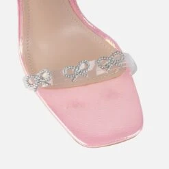 One for the girly girls. Featuring a square toe, perspex straps with dimante bow details, metallic sole and a stiletto heel. Pair with a pink dress for the ultimate girly girl look.