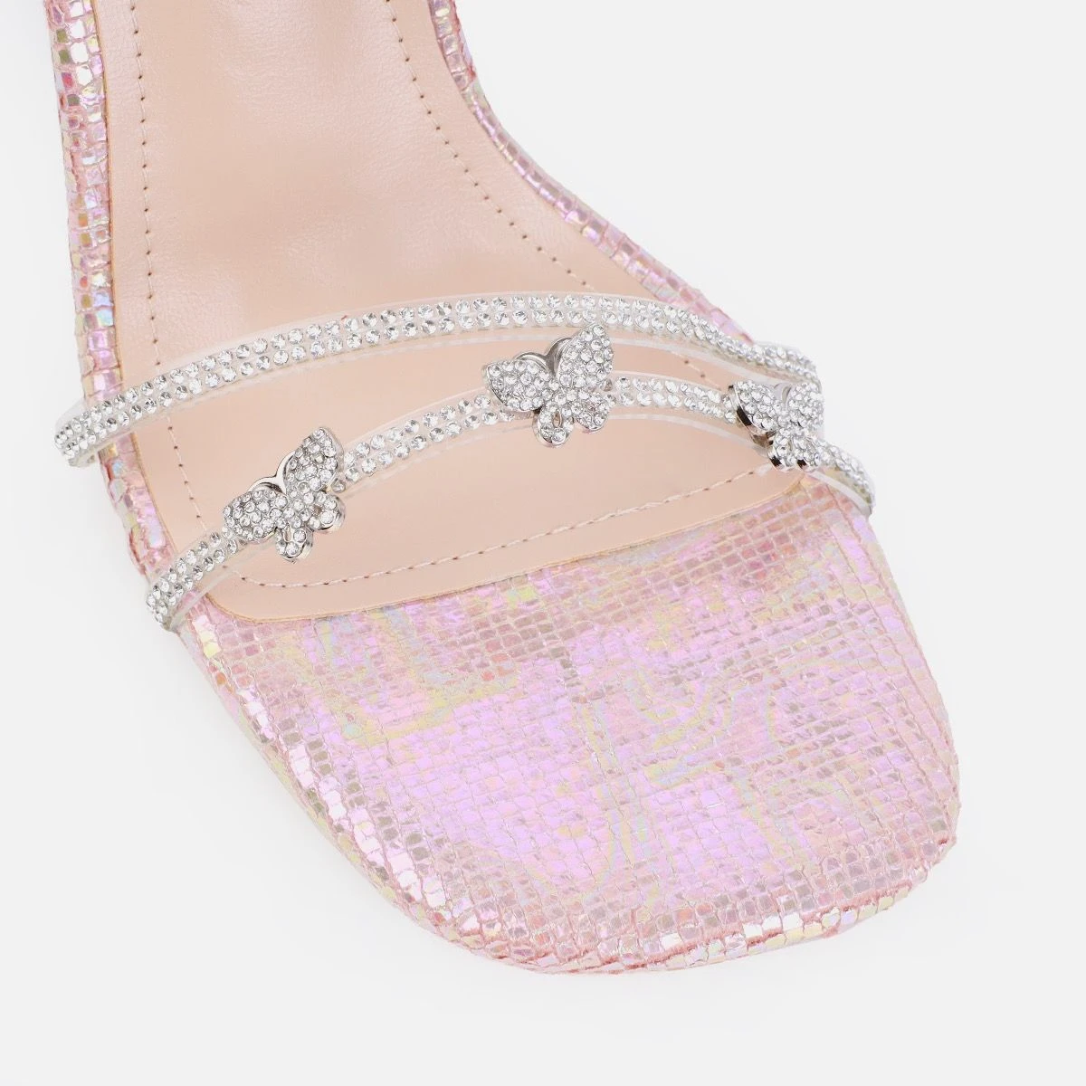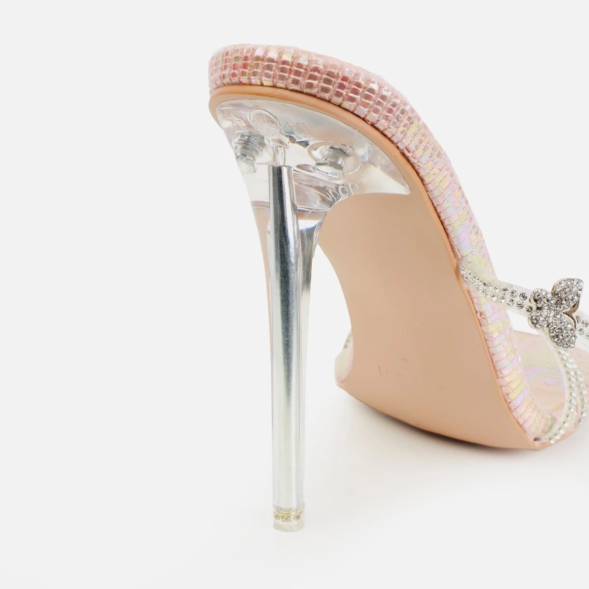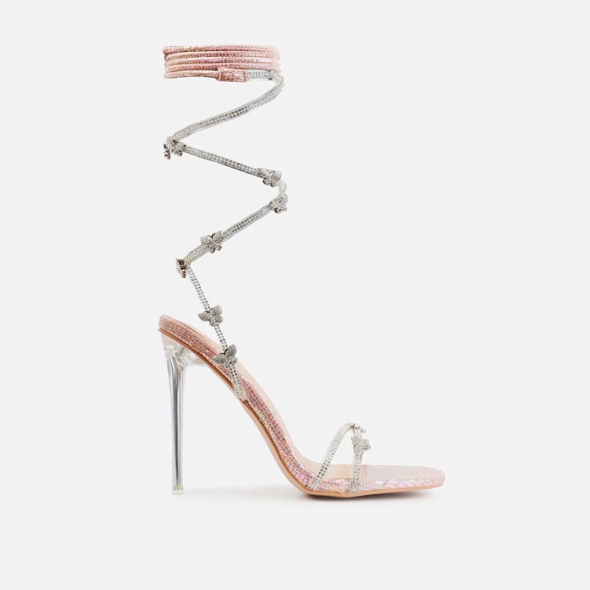 pure princess vibes in these heels. featuring rounded square toe, diamante butterfly front straps/lace ups and a clear stiletto heel. wear with matching butterfly accessories!