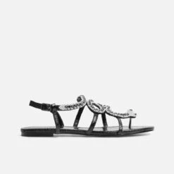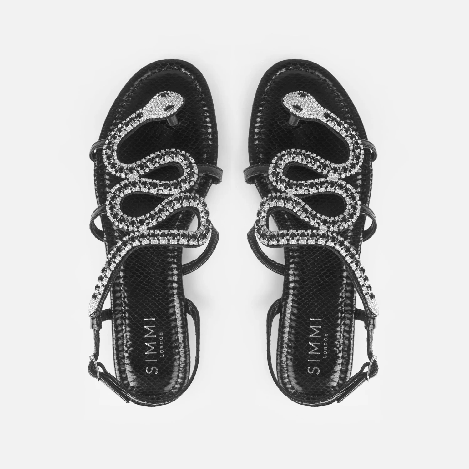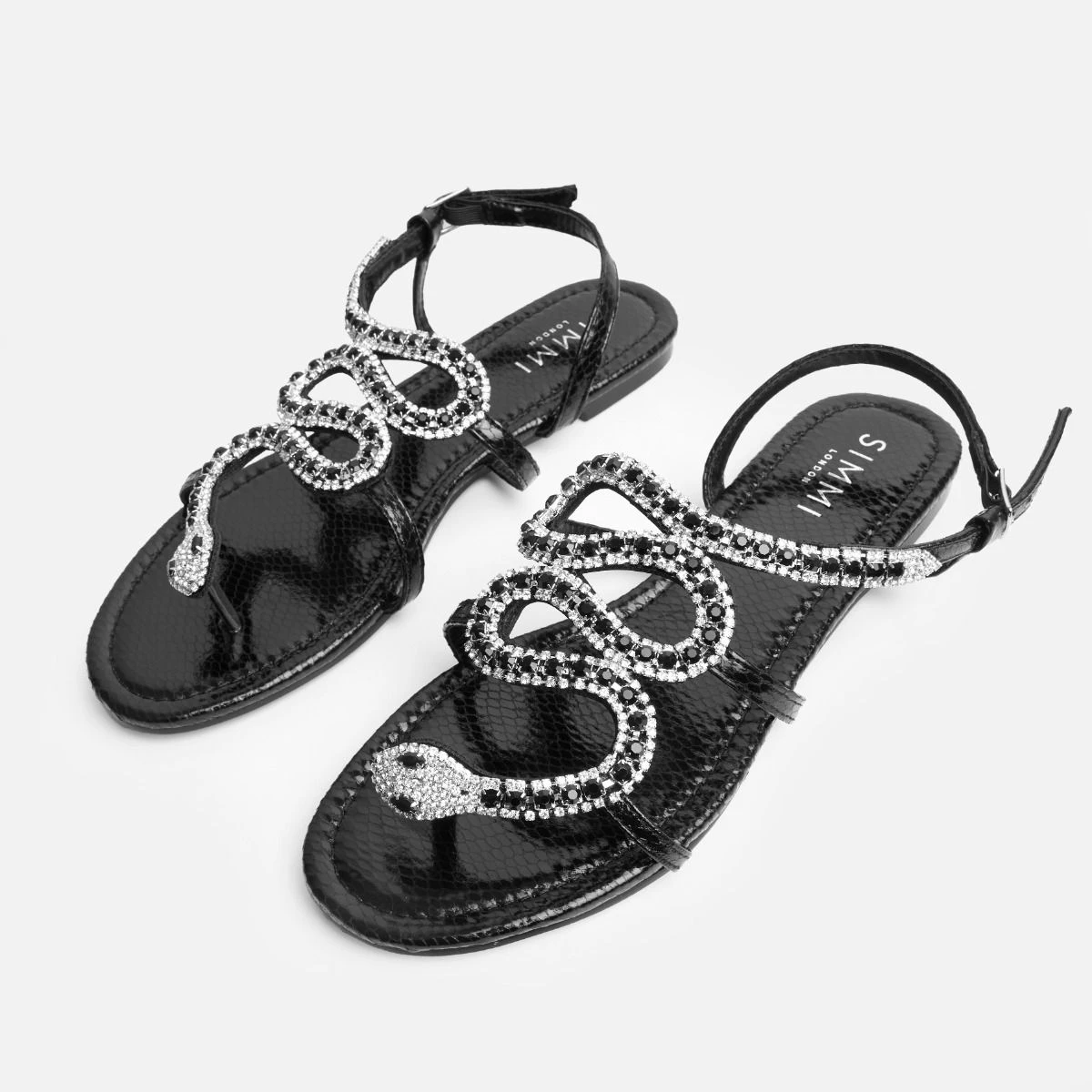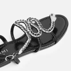 slip into these snake flat sandals. featuring a diamante snake front trim and an ankle buckle strap. wear these with matching diamante accessories.