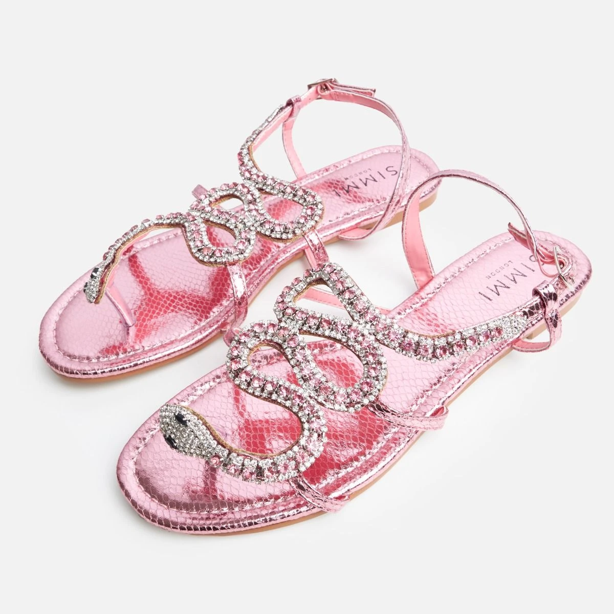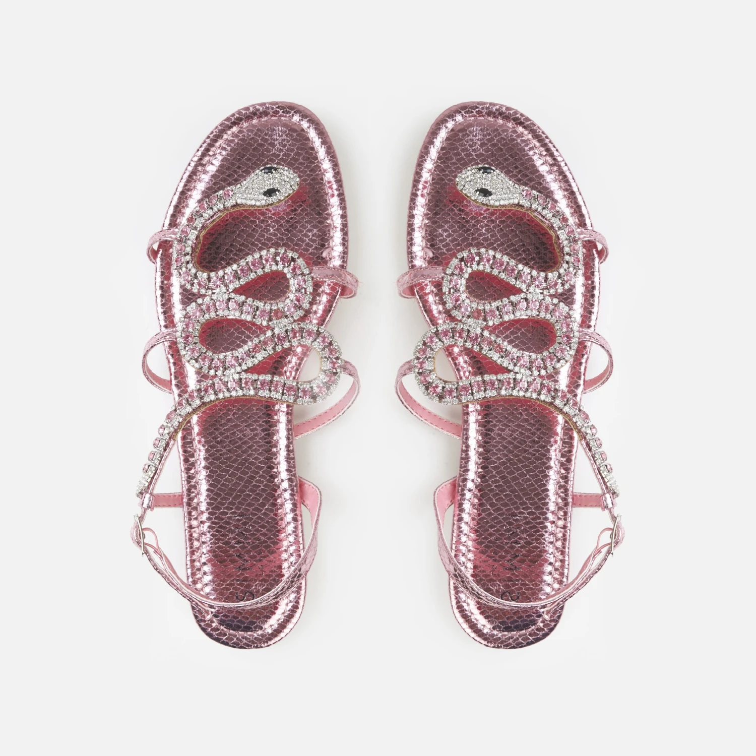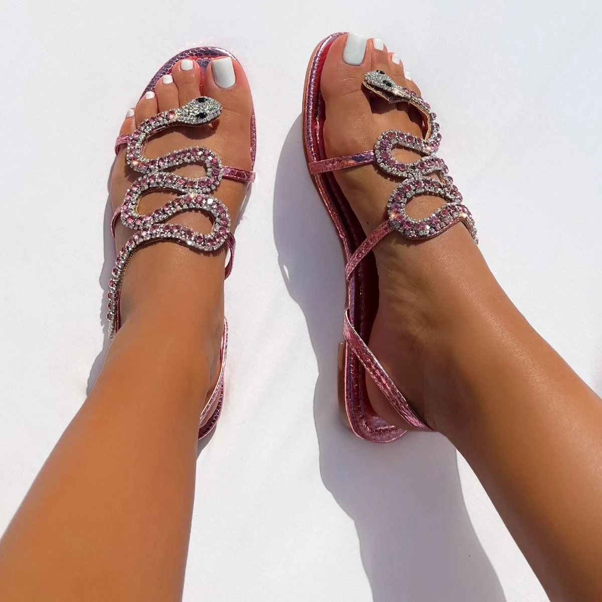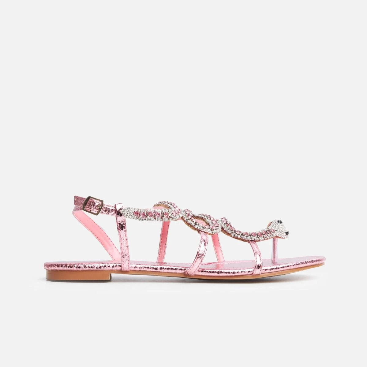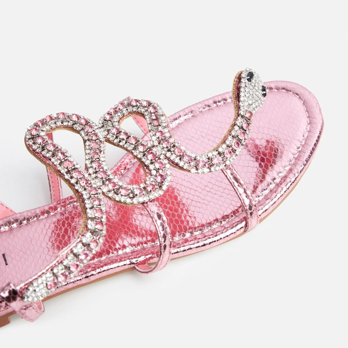 slip into these snake flat sandals. featuring a diamante snake front trim and an ankle buckle strap. wear these with matching diamante accessories.
