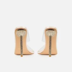 your new staples are these! featuring a square toe, clear front straps and a diamante stiletto heel. wear these with cargo pants and a crop!