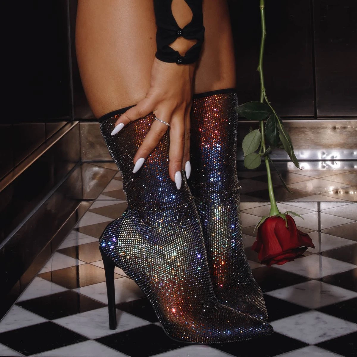 sparkle this season in these heels. featuring a pointed toe, mesh diamante material and a stiletto heel. style with your fave LBD.