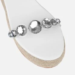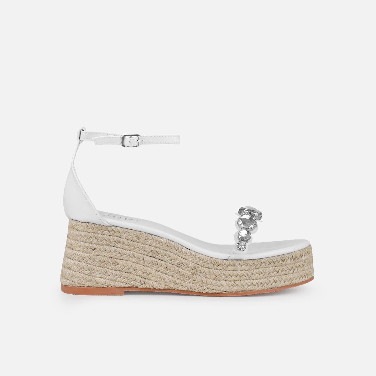 These gem wedges are always a good idea. Featuring a clear gem front strap, ankle buckle strap and an espadrille wedge. Wear with your fave denim/summer fits.