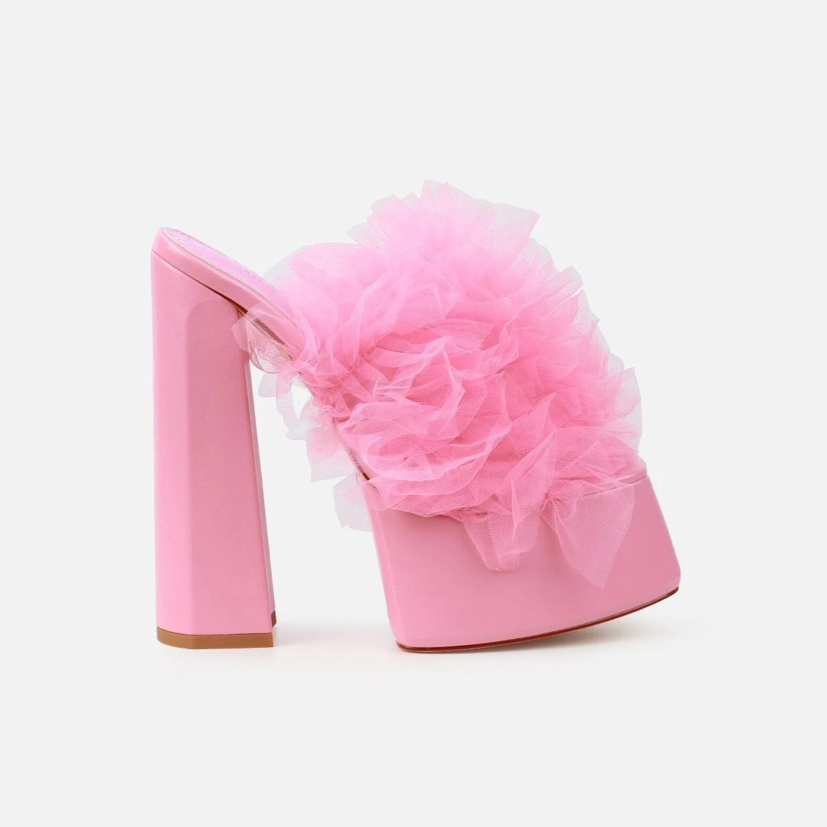 Get ready to turn heads with these tulle platform heeled sandals. These are the perfect combination of sass and class. The tulle adds a flirty and feminine touch, whilst the platform adds some serious attitude to your look. Perfect for a night out with the girls or a date night with your special someone.