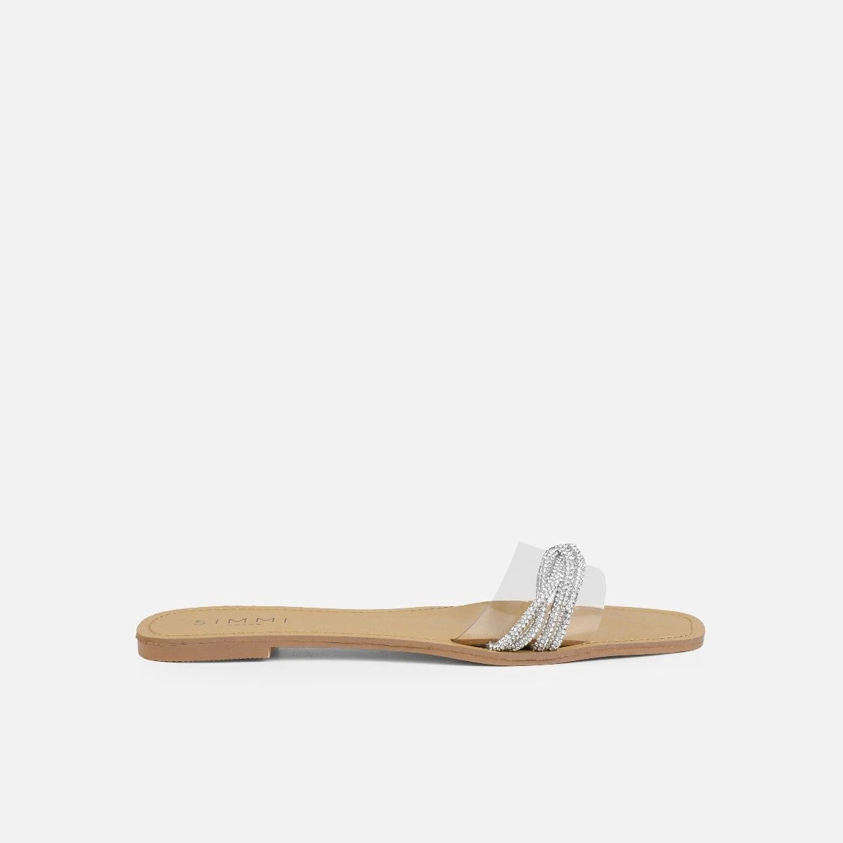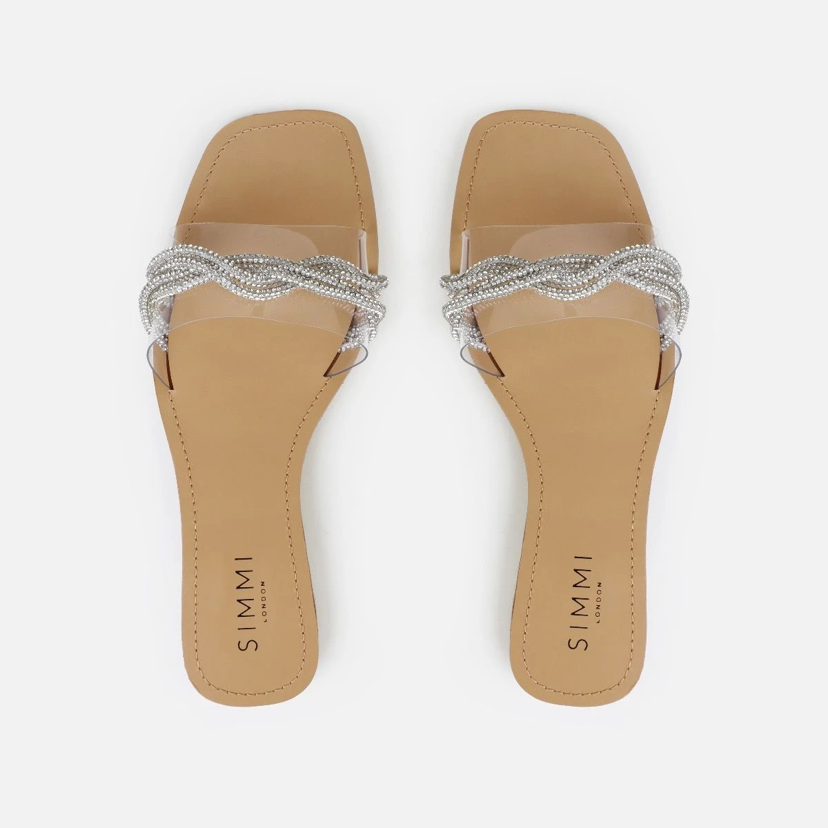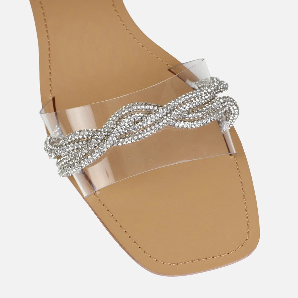 You + these flat sandals = match made in heaven. Featuring a clear front strap with a diamante twist trim. You’ll be wearing these with your summer casj and dressy fits.