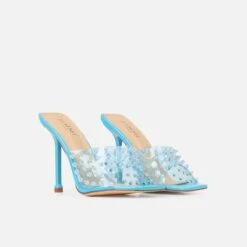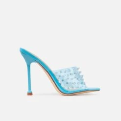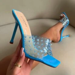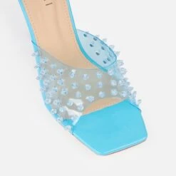 steal the show in these mules. featuring square toe, clear front strap with clear spike trims and a stiletto heel. style them up with a killer outfit!