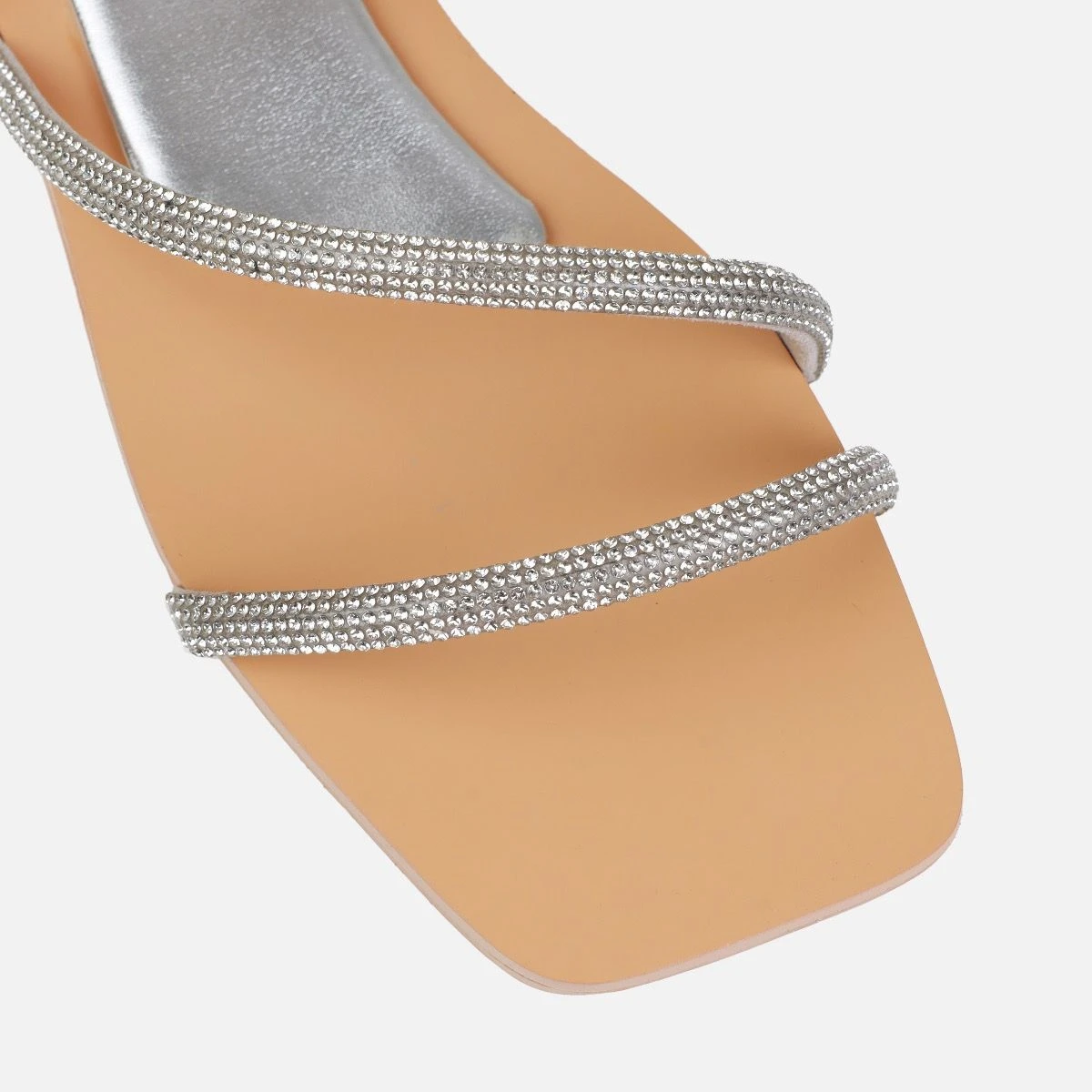 Make these diamante spiral flats your wardrobe essential. Featuring a square toe, diamante front straps and ankle spiral strap. You’ll be wearing these all summer.