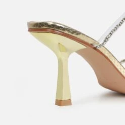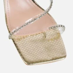 Show up and show out in these clear diamante mid heels. Featuring a square toe, clear diamante toe loop and front straps and a mid heel. We like these worn with satin slip dresses and oversized blazers.