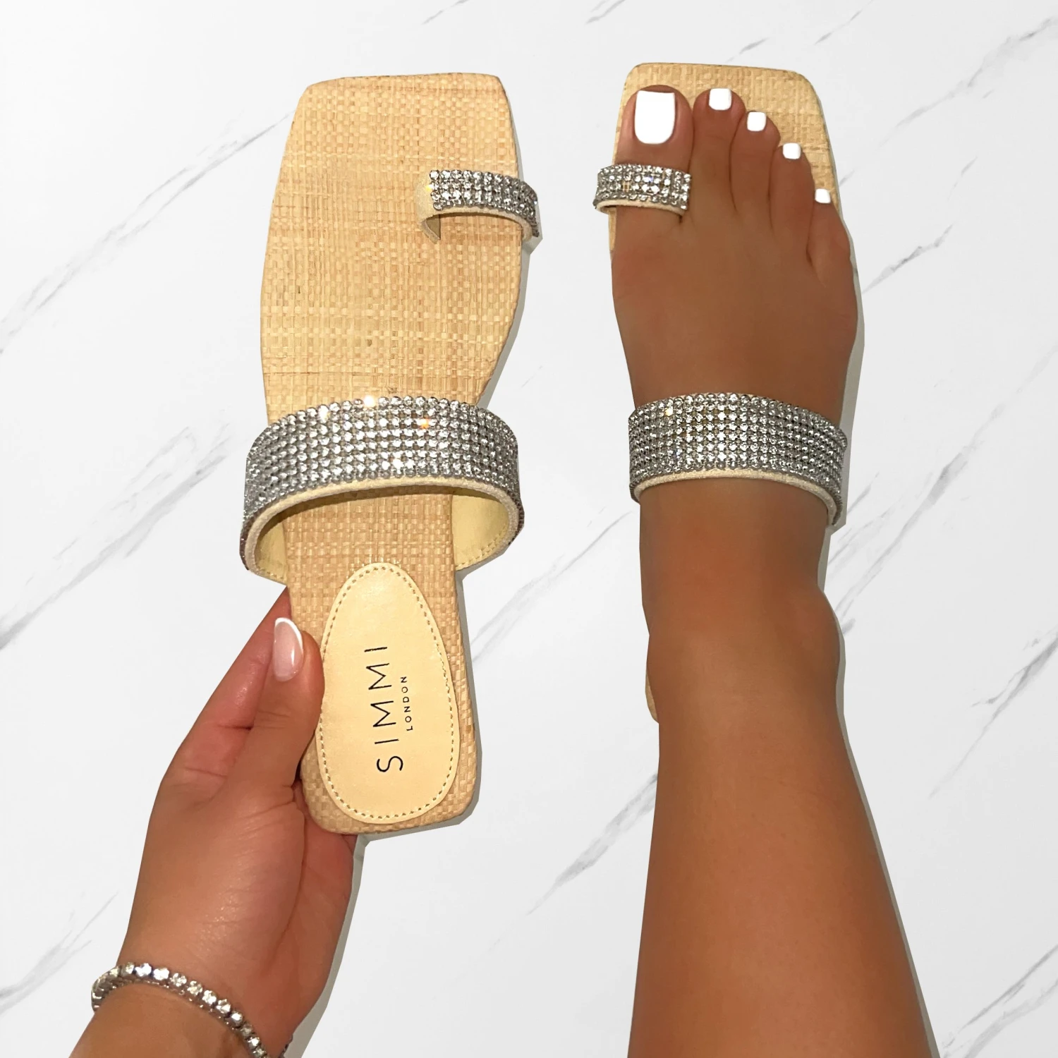 Make these raffia diamante flat sandals yours! Featuring a diamante toe loop and raffia sole. Team them up with matching diamante or raffia accessories.