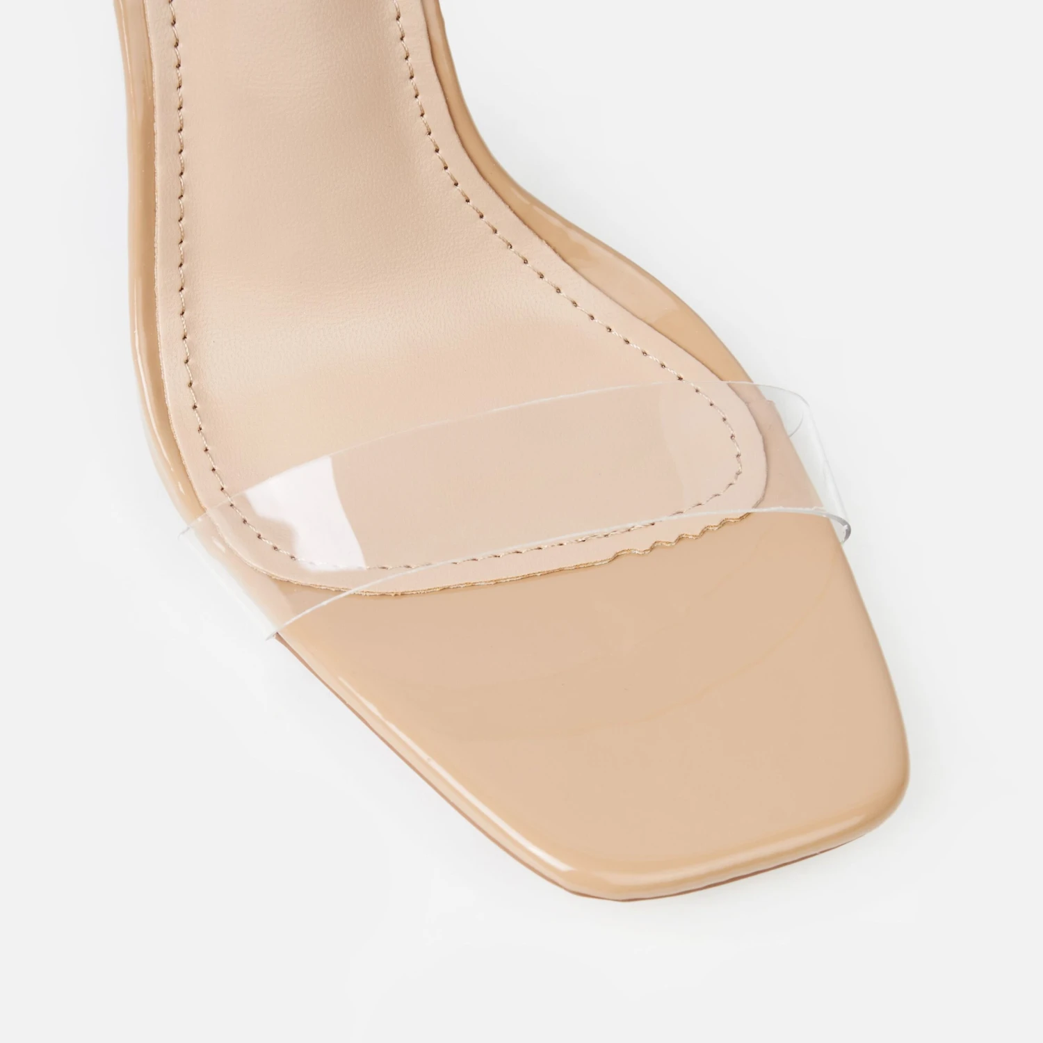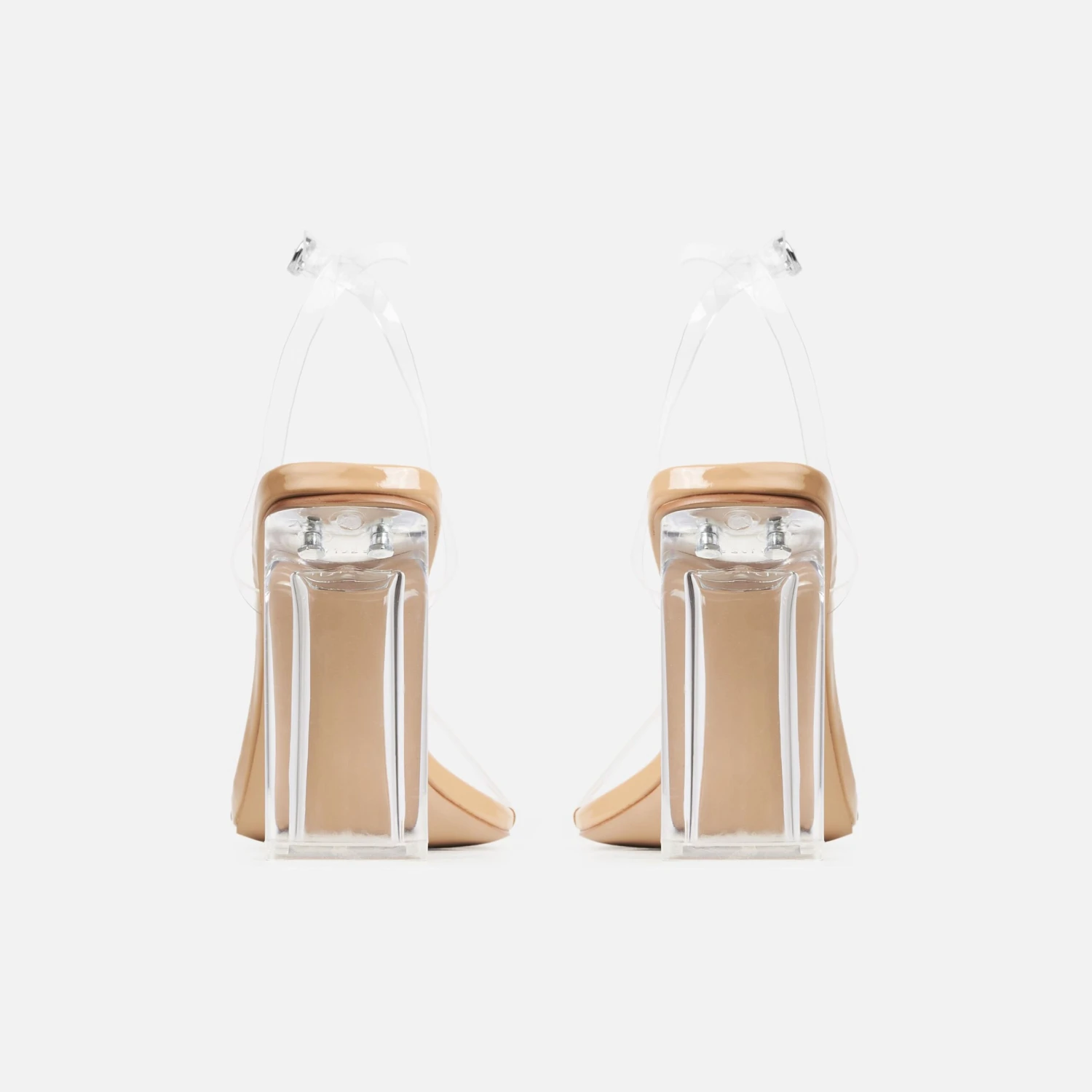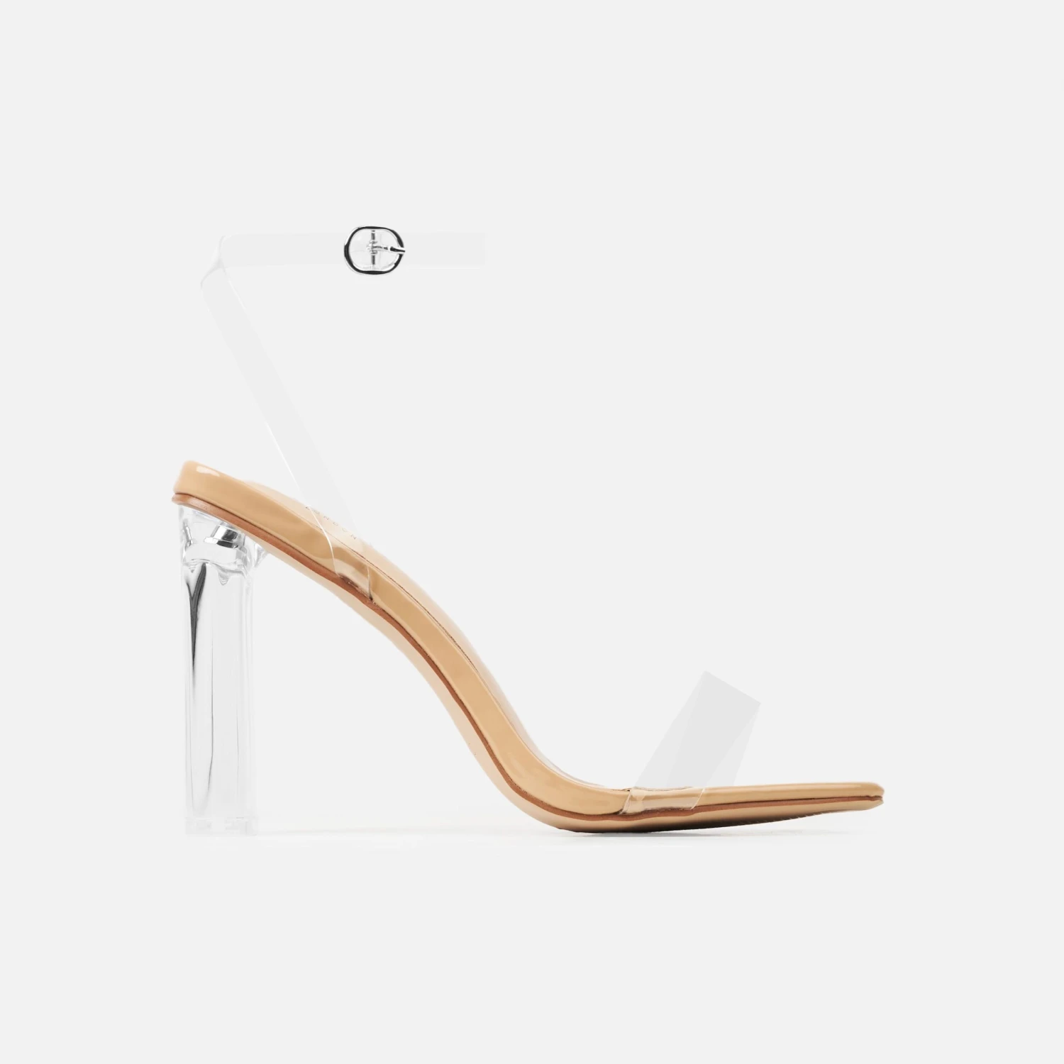 an effortless feel. featuring a square toe, clear front strap, clear ankle buckle strap and a clear block heel. team these with all your dressy casj and evening looks.