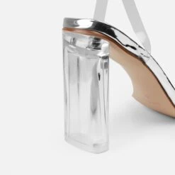 an effortless feel. featuring a square toe, clear front strap, clear ankle buckle strap and a clear block heel. team these with all your dressy casj and evening looks.
