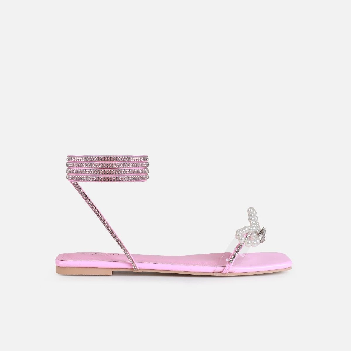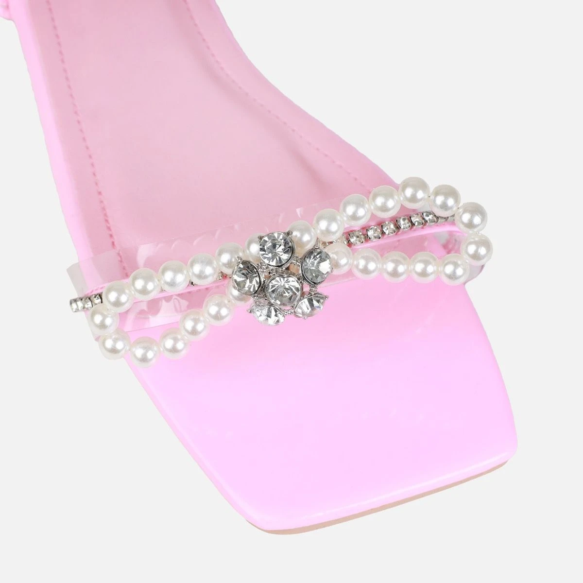 Add details to your flats game with these pearl diamante lace ups. Featuring a square toe, clear front strap with pearl bow and diamante lace ups. Wear these all spring/summer season.