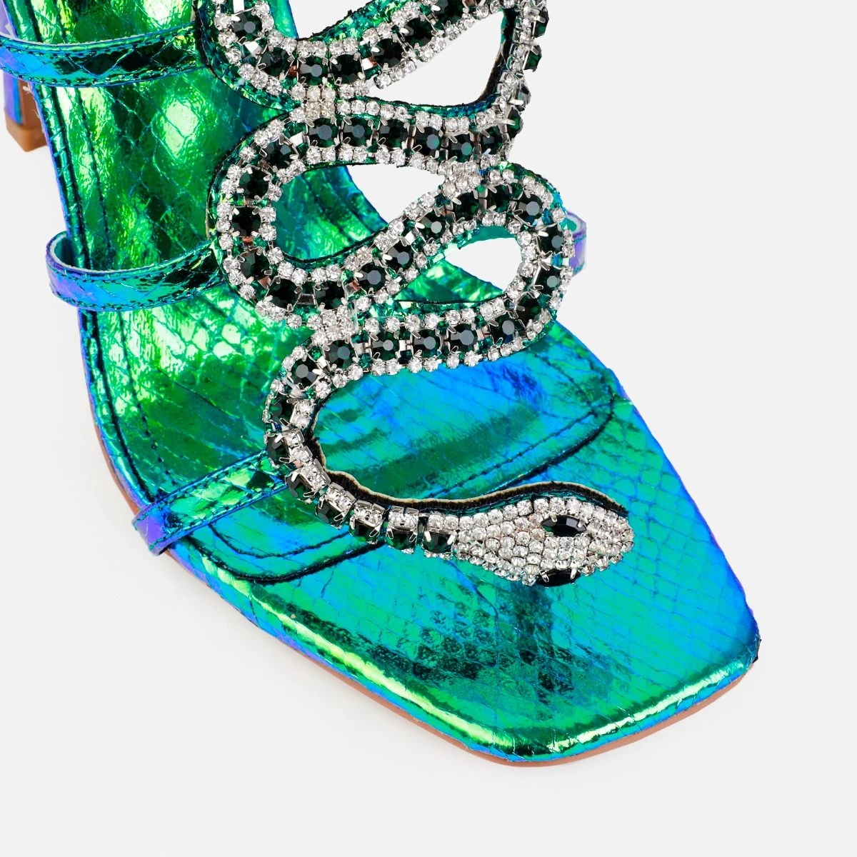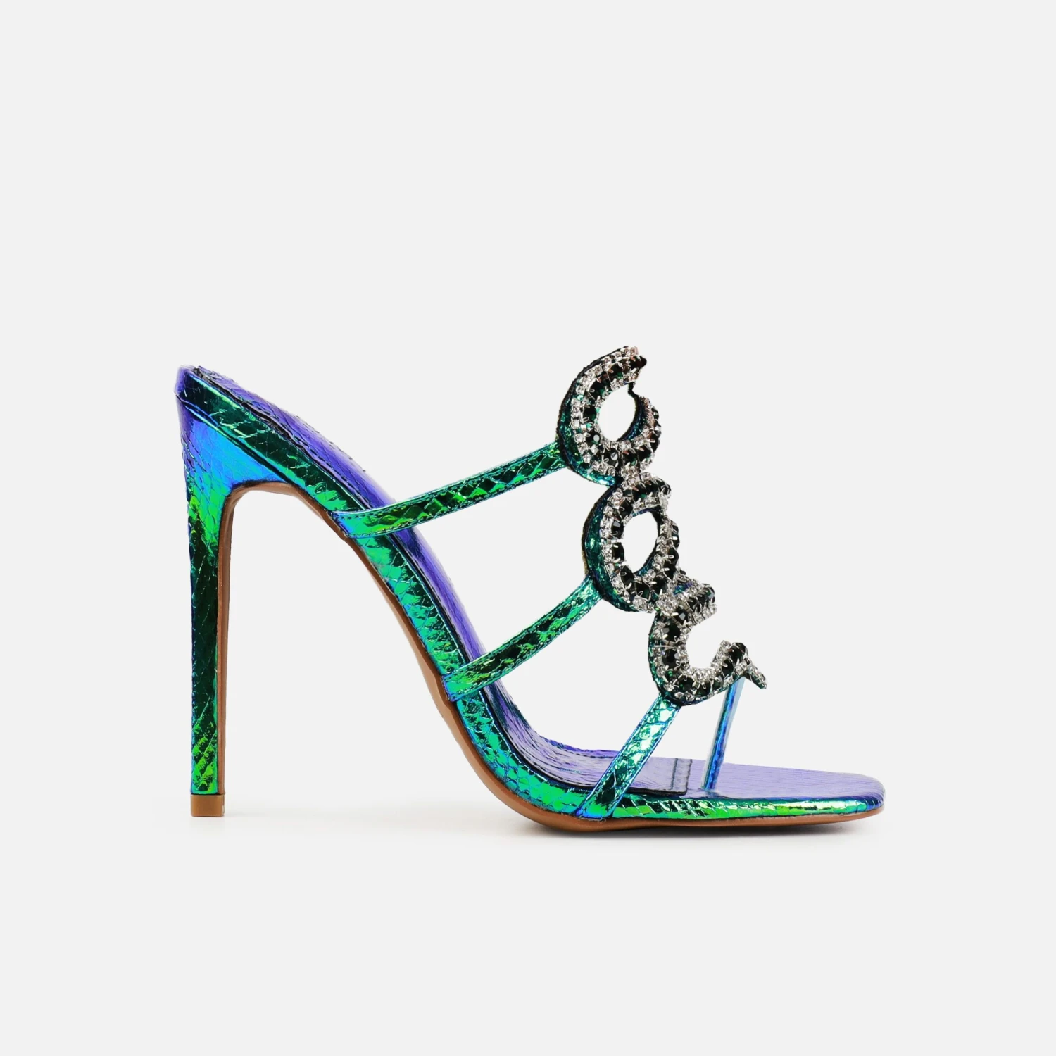 baby you’re a snake charmer in these heels. featuring diamante gem snake front trim and a stiletto heel. style them up with your fave evening looks.