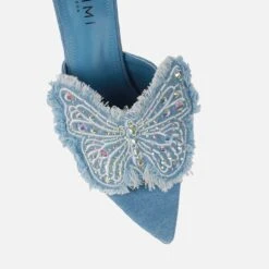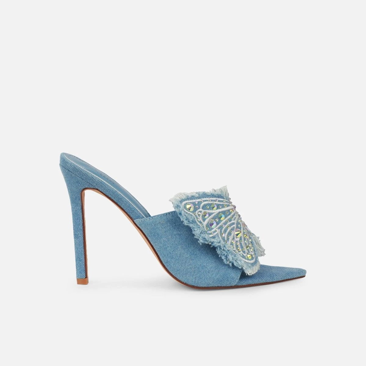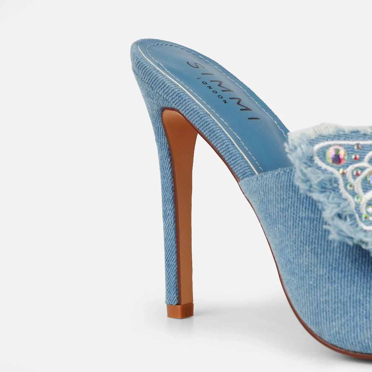 Must-haves for any fashion-forward girl out there! Featuring an open toe design, denim butterfly detail decorated with rhinestones and a stiletto heel. Wear these diamante mid heel mules with a cute sundress or a pair of high-waisted shorts.