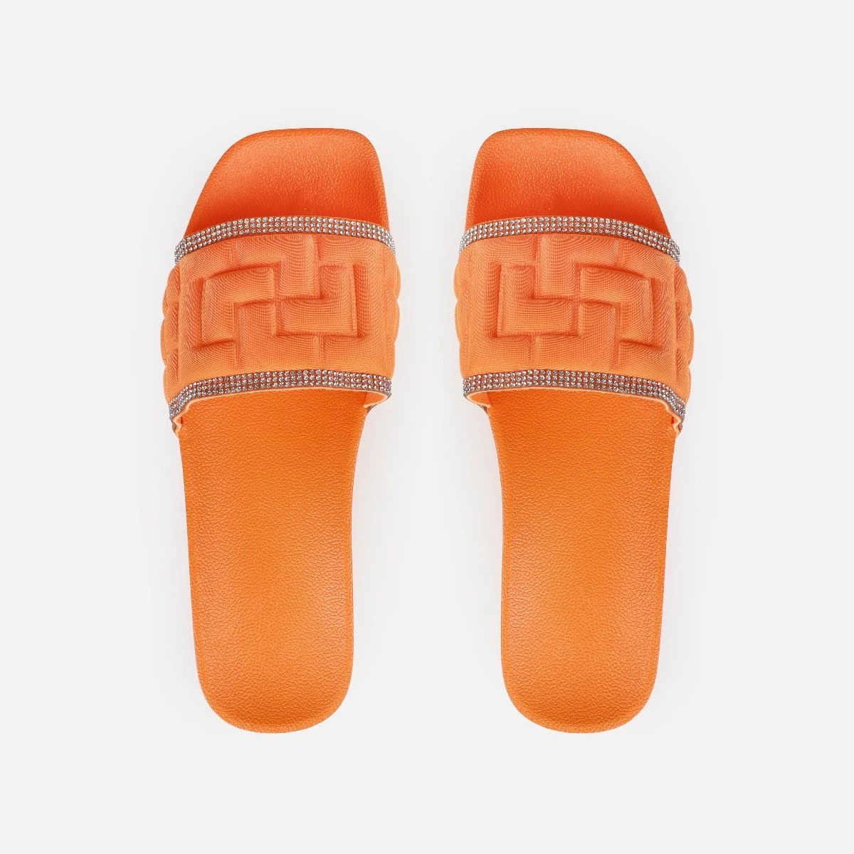 The perfect slides have arrived! Featuring a square toe, embossed pattern with diamante trims and a chunky flat sole. Wear these on holiday and around the house!