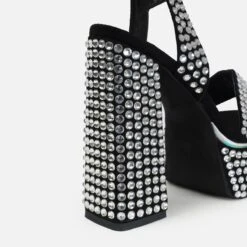 Make a shoe statement in these diamante block heels. Featuring a diamante covered front strap, platfor, block heel and ankle buckle strap. Wear with diamante accessories.