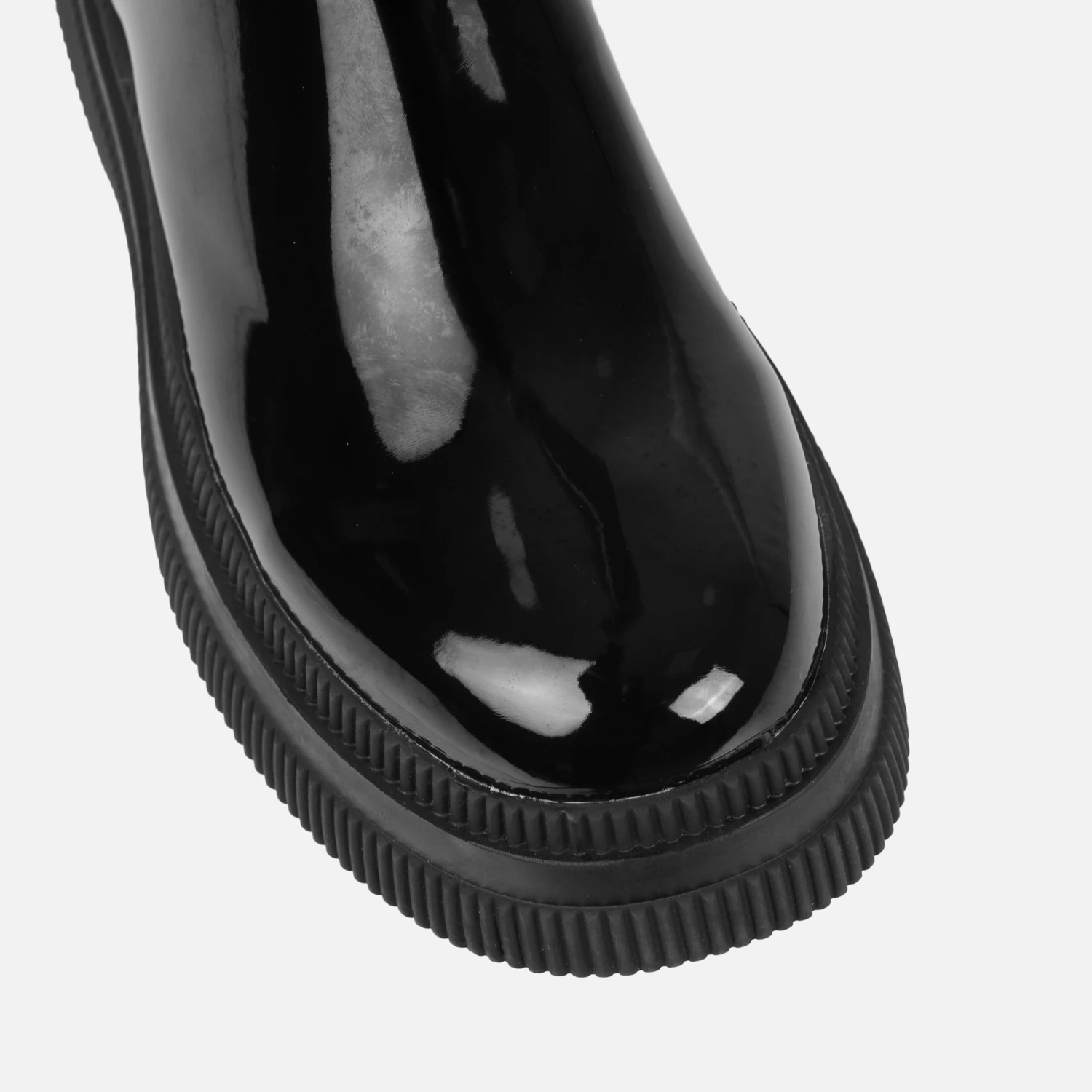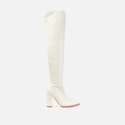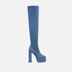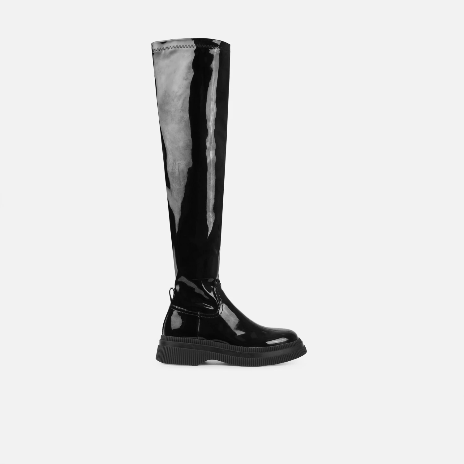 all eyes on these thigh high boots. featuring a chunky flat platform sole and inside zip. pair these with mini dresses/co-ords.